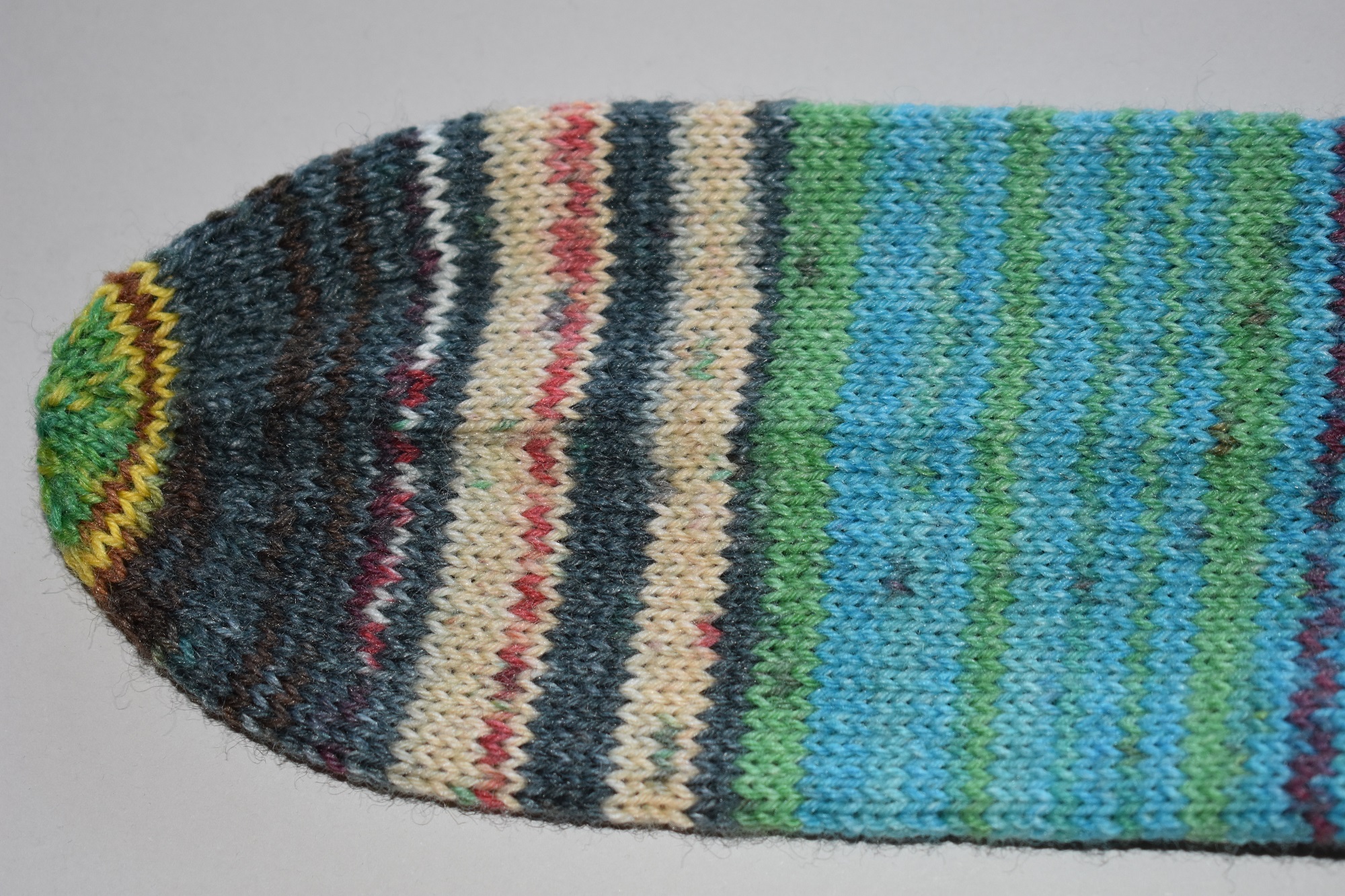 Ich stricke die Socken alle selbst. Die Spitze bevorzuge ich in Sternenform.