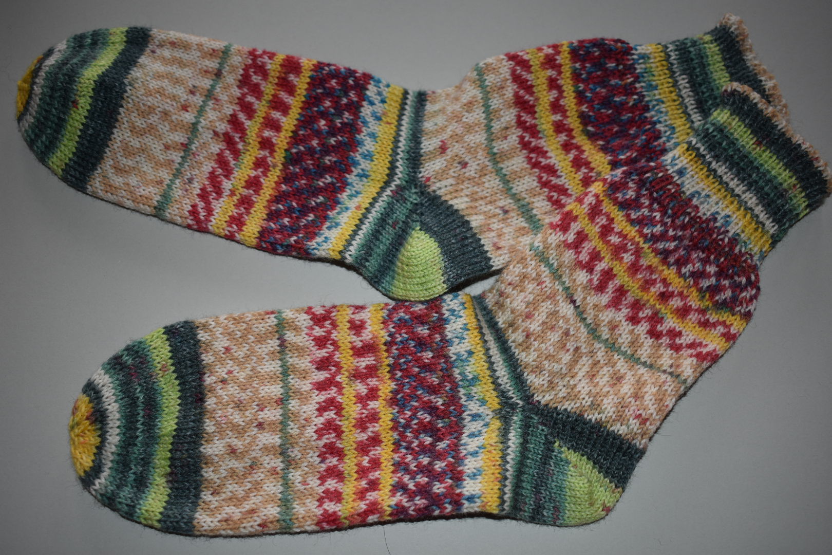 Ich stricke die Socken alle selbst. Die Spitze bevorzuge ich in Sternenform.