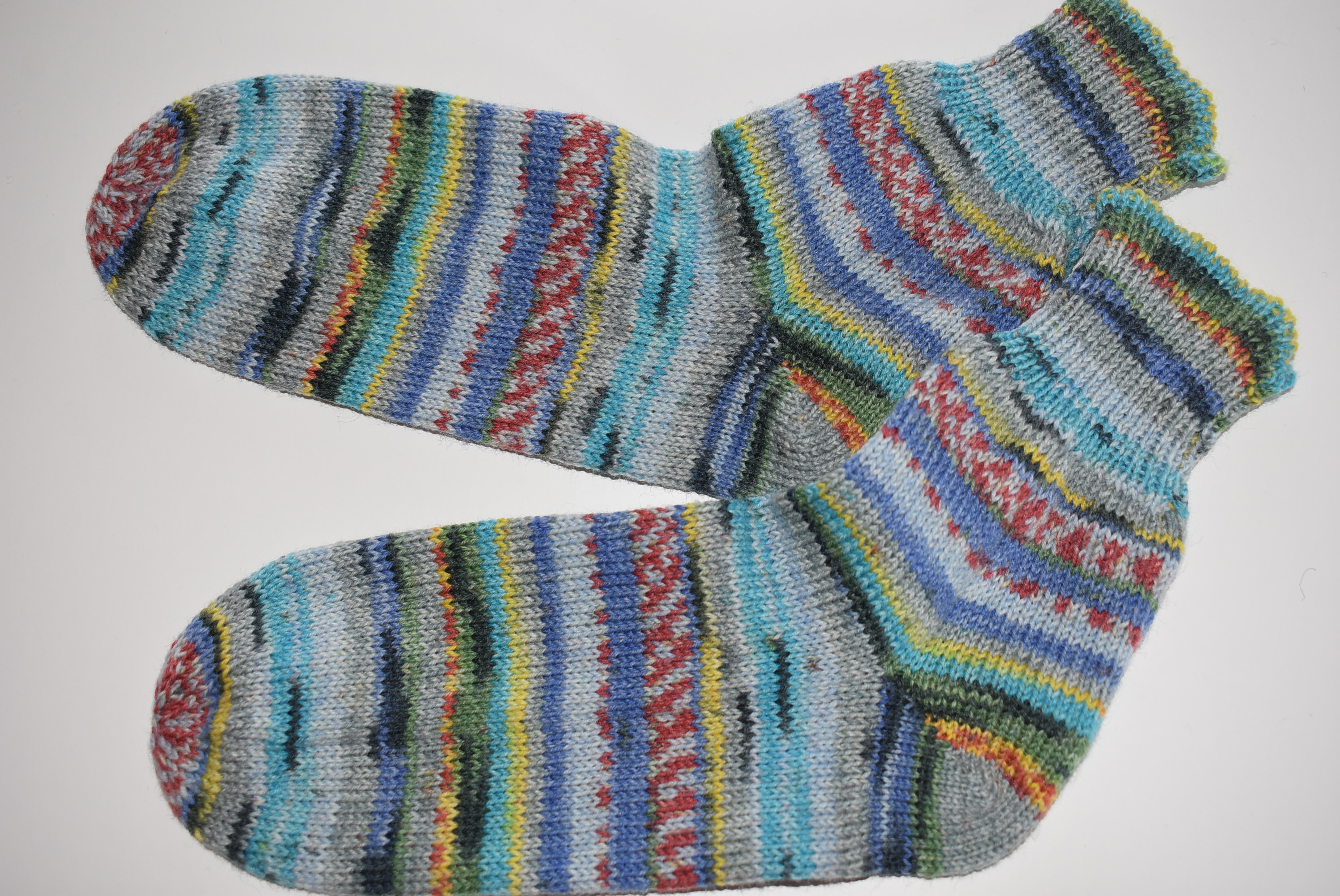 Ich stricke die Socken alle selbst. Die Spitze stricke ich in Sternenform, die Fußspitze hat somit keine Naht und passt sich dem Fuß an,
