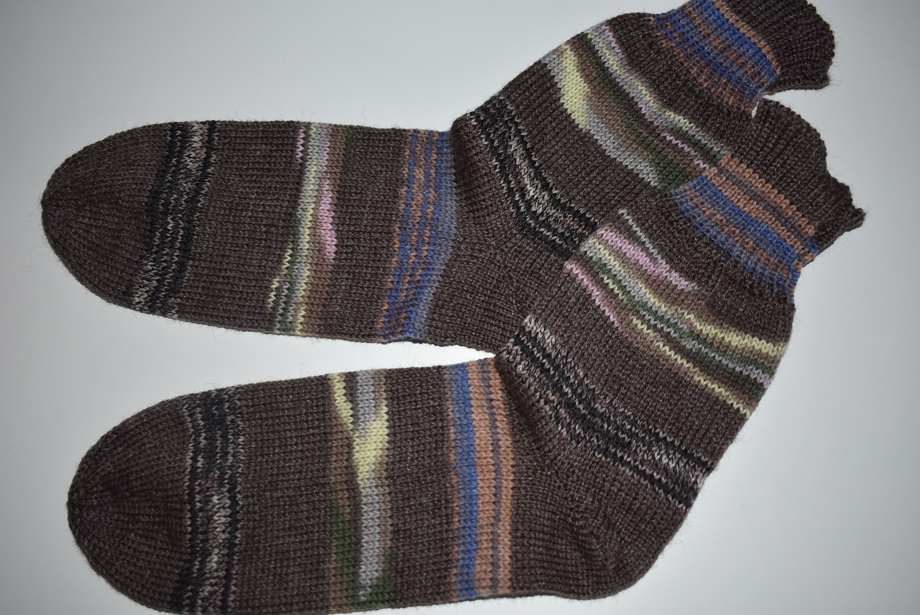 Nur das Bündchen stricke ich auf der Handstrickmaschine, daher haben die Socken Verarbeitungsbedingt über das Bündchen ca.7 cm (rückwärtiger Schaft) eine kaum sichtbare und spürbare,sorgfältig vernähte Naht.