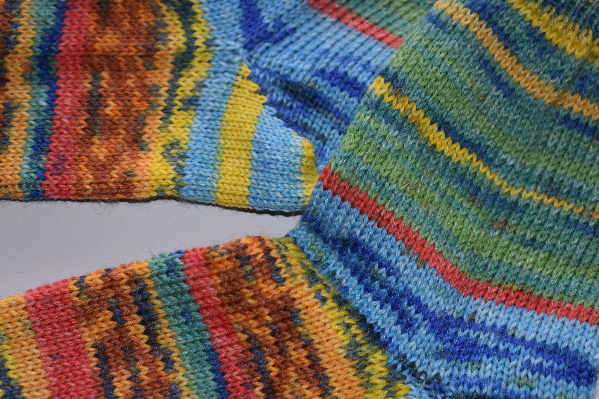 Nur das Bündchen stricke ich auf der Handstrickmaschine, daher haben die Socken Verarbeitungsbedingt über das Bündchen ca. 7 cm (rückwärtiger Schaft) eine kaum sichtbare und spürbare,sorgfältig vernähte Naht.